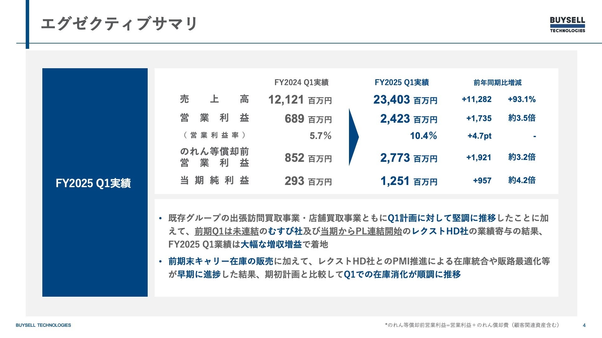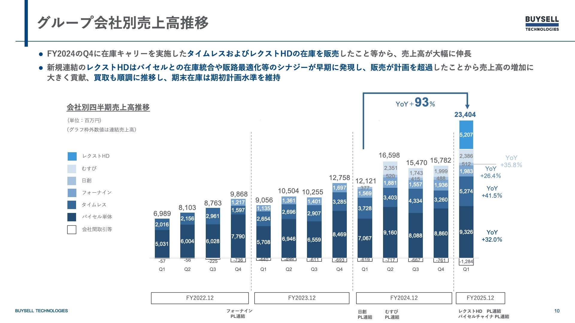 当第1四半期より新規連結のレクストHDは、バイセルとのシナジーが早期に発現し販売が計画を超過したことから、売上高の増加に大きく貢献。買取も順調に推移し、第1四半期末在庫は当初計画水準を維持しています。