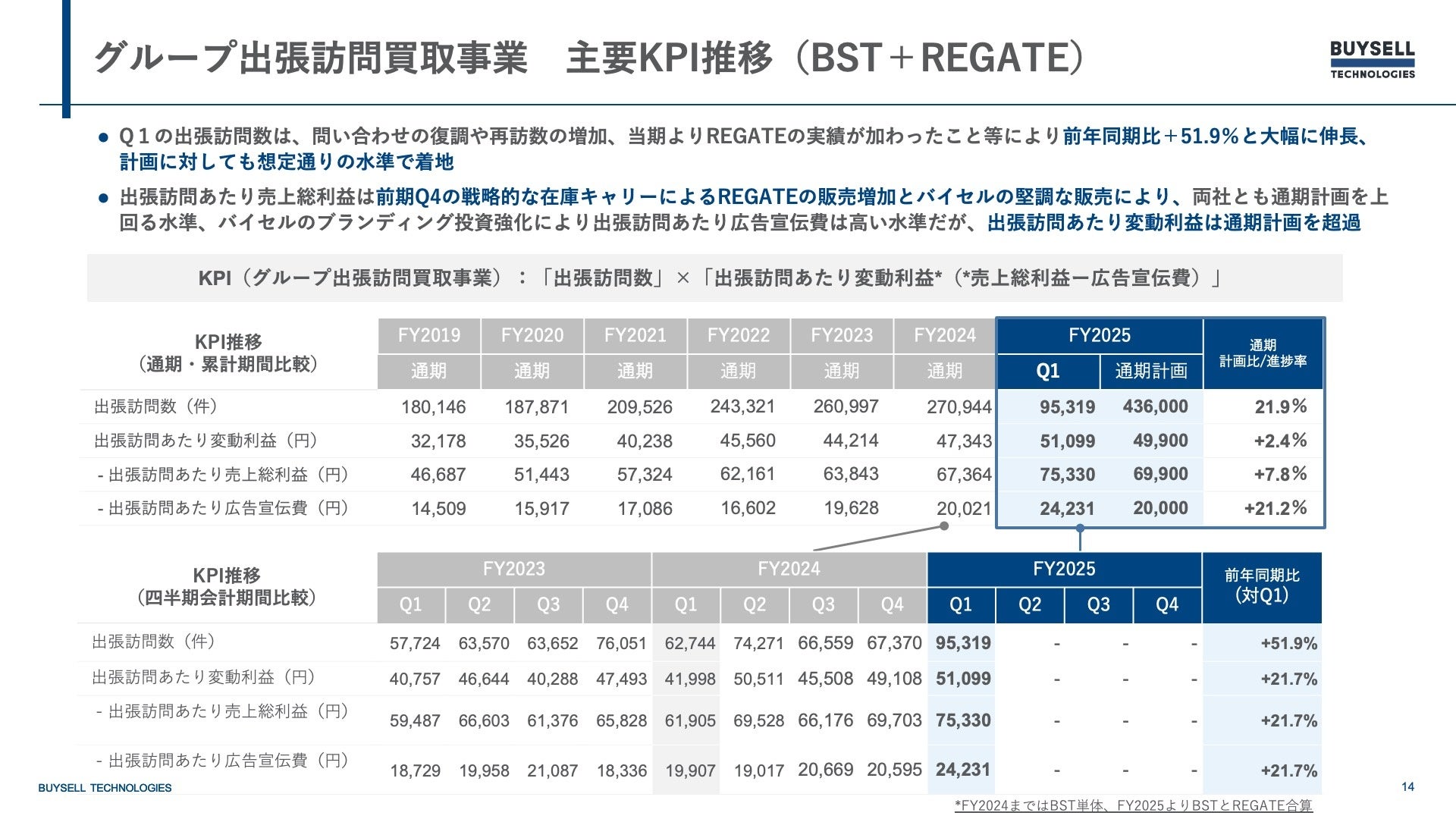 出張訪問あたり売上総利益はバイセル単体及び前期Q4に戦略的な在庫キャリーを実施したREGATEともに販売好調のため通期計画を大幅に超過。出張訪問あたり広告宣伝費もバイセル単体のブランディング投資強化により高い水準となりましたが、出張訪問あたり変動利益は通期計画を超過する水準に着地いたしました。