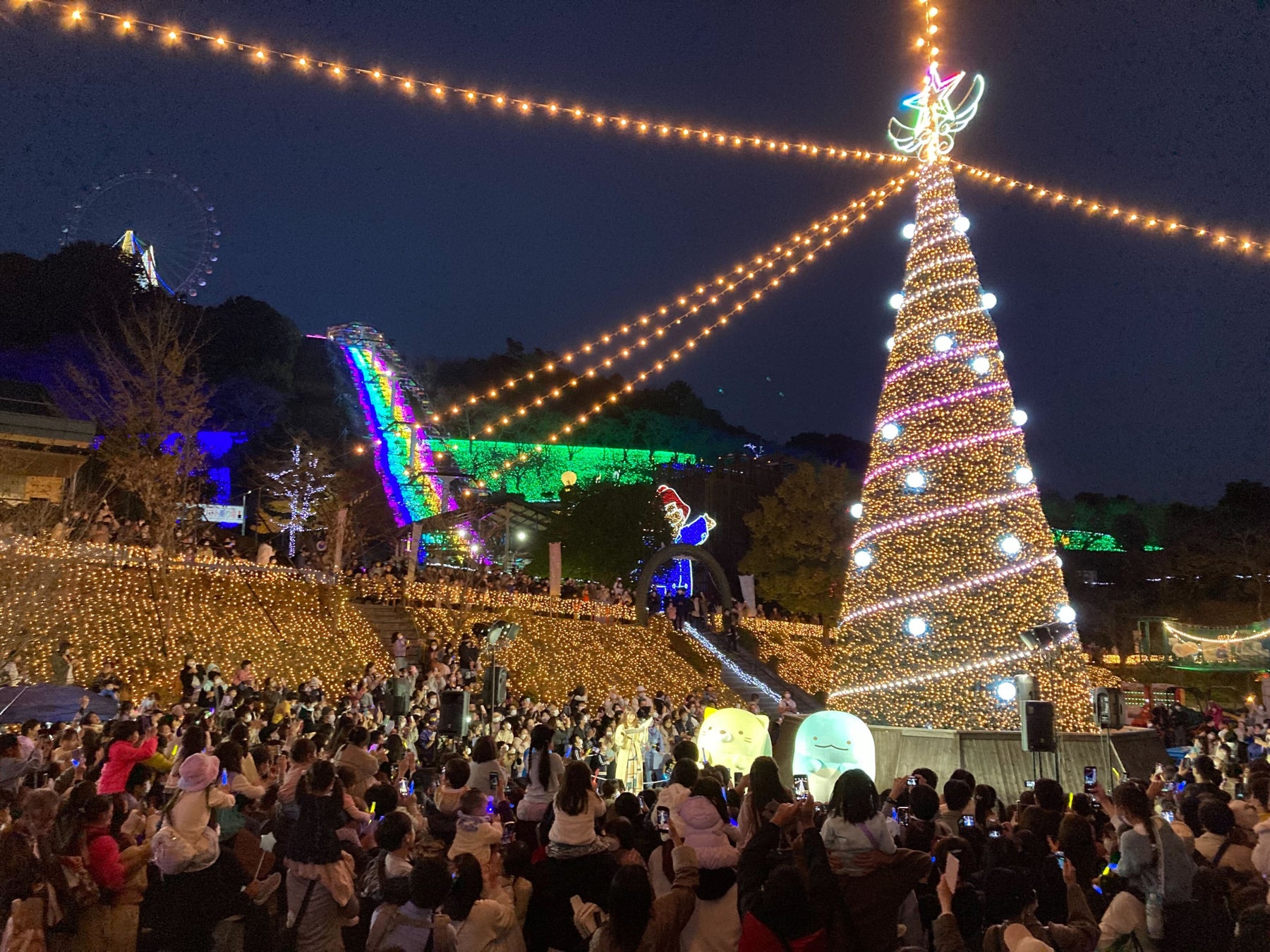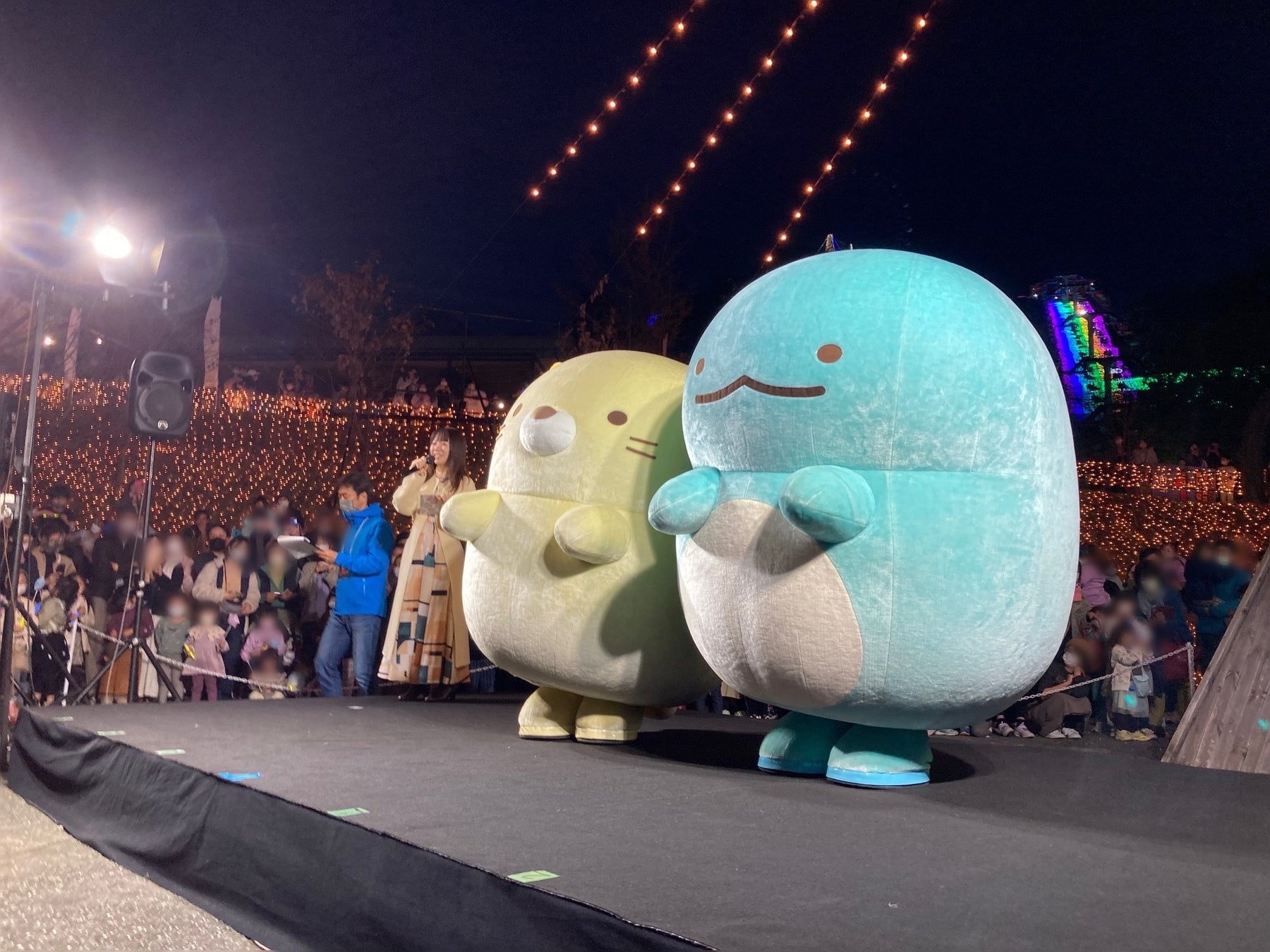 MCにエフエム富士のラジオパーソナリティ東城佑香さん、特別ゲストとしてすみっコぐらしの「ねこ」と「とかげ」も登場。集まったお客様がスティックライトを振りシンボルツリーが点灯すると、続いて園内600万球のイルミネーションが一斉に点灯し、約1,200人のお客様とともに、華やかにオープニングを迎えました。
