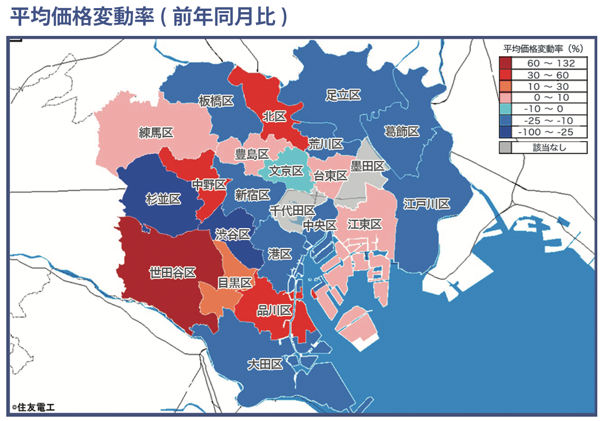 東京23区を各行政区毎に供給戸数、平均価格、平均面積、平均坪単価を前年同月も併せて算出。また前年対比での価格変動率を変動幅毎に区分けしポリゴン表示しました。