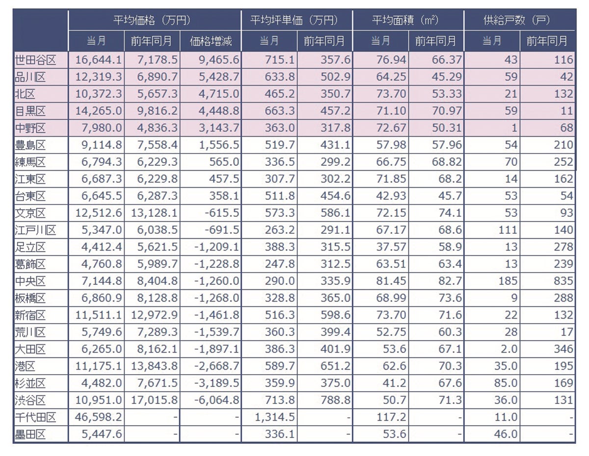 当社調べの2022年11月度東京23区別速報値分譲実績データです。