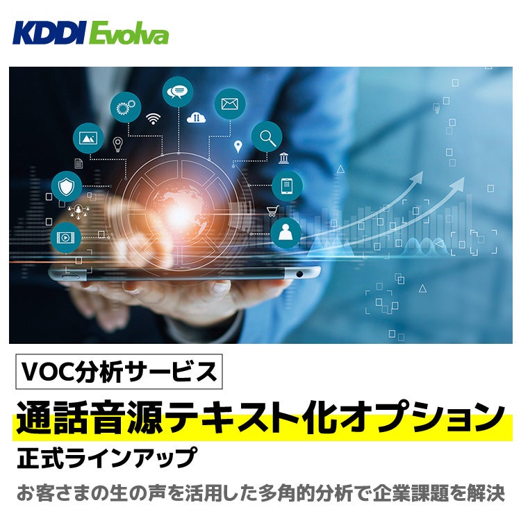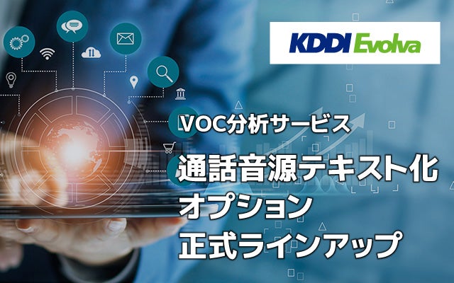 KDDIエボルバの「VOC分析サービス」は、テキストマイニングやコールリーズンの分析によってお客さまの声を可視化し、コンタクトセンターの改善・最適化に活用するアセスメント・コンサルティングサービスです。このたび新たに音声認識技術を利用した「通話音源のテキスト化オプション」を提供することにより、「応対音源データ」=「お客さまの生の声」をそのままVOC分析に活用することが可能となりました。