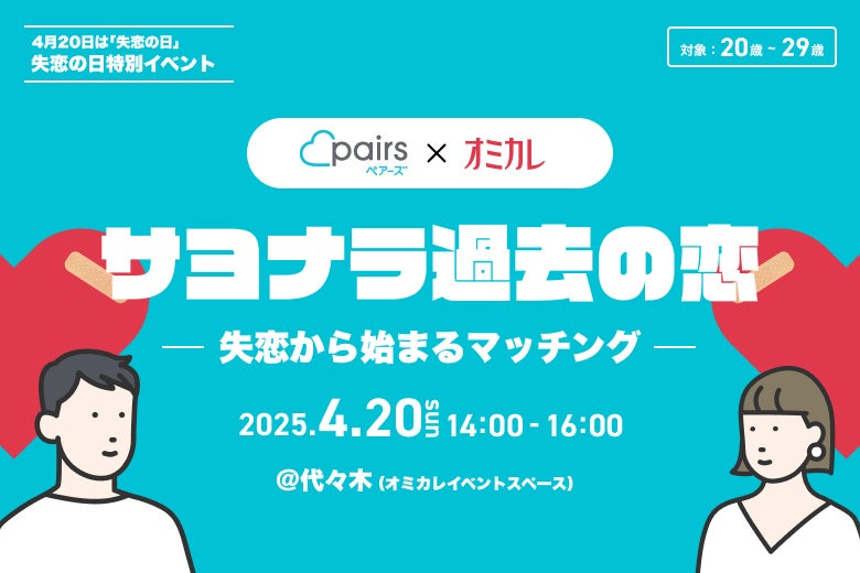 このたびオミカレは、恋活・婚活マッチングアプリ「Pairs(ペアーズ)」を運営する株式会社エウレカ(本社:東京都港区、代表取締役CEO:⼭本⻯⾺、以下 ペアーズ)との連携企画として、4月20日「失恋の日」にちなんだ、リアルでのマッチングイベントを開催することとなりましたので、お知らせいたします。