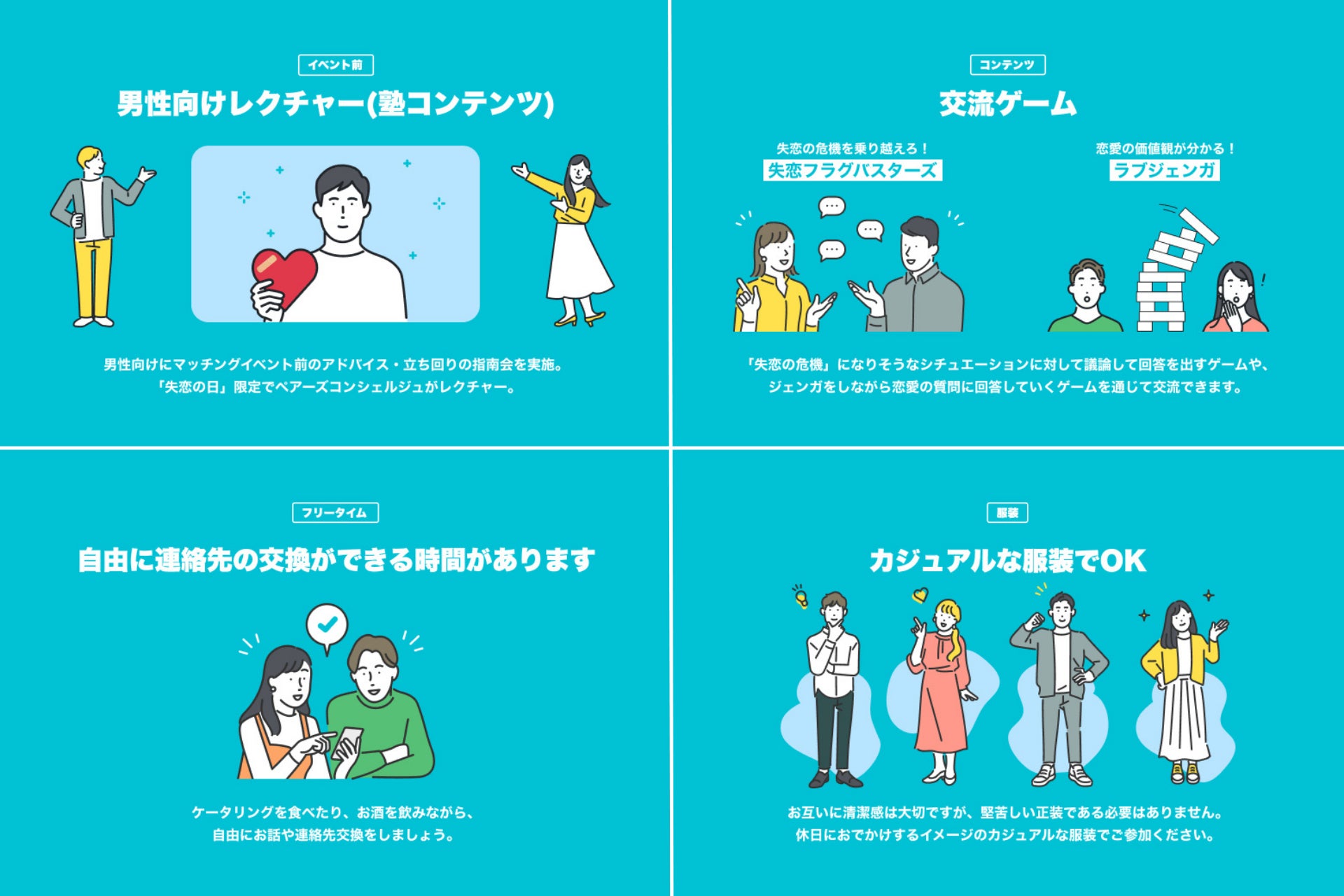 このイベントでは、失恋を経験しながらも、前向きに真剣な出会いを探している、それぞれのサービスのユーザー同士の出会いの場を提供することで、新たな恋のきっかけになることを目指しています。