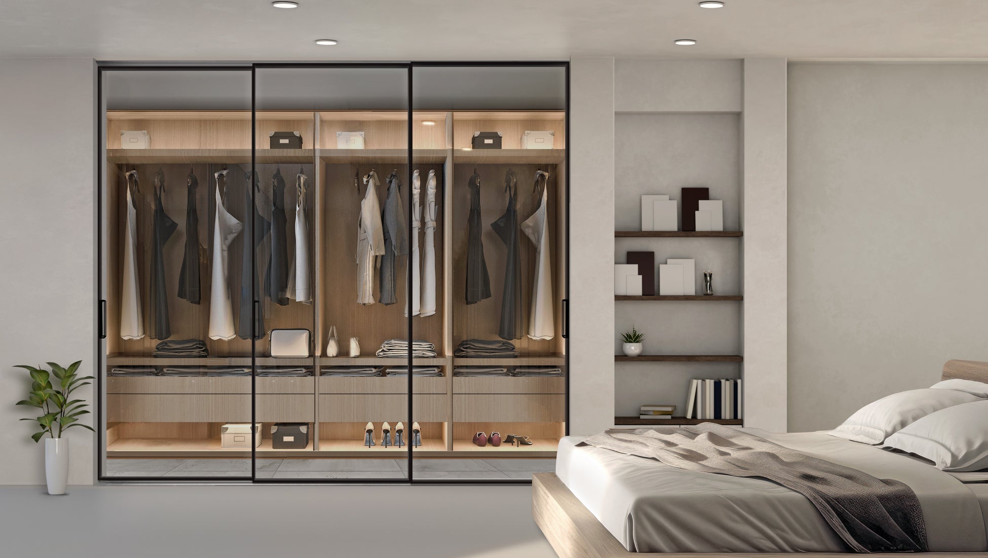 従来クローゼットの中は扉で隠すという考えが常識でしたが、ここ数年、好きなものをあえて見せたいというオープンクローゼットの需要が増えてきました。特に最近は、海外の邸宅で使われる全面ガラスの「見せる収納」が高級住宅層の間で流行の兆しをみせています。