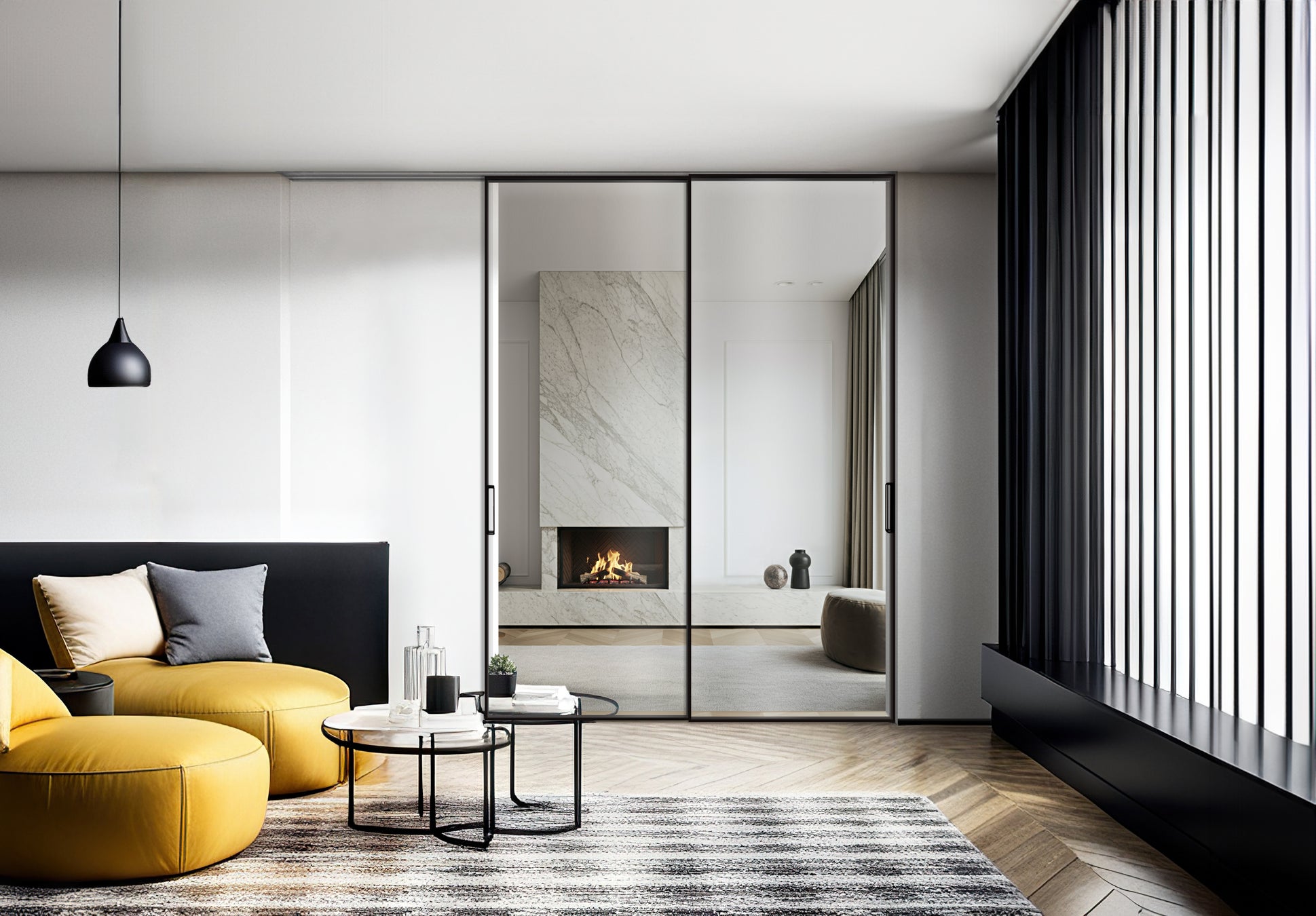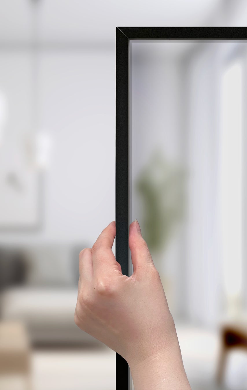 この商品の他社との最大の違いは、フレームの細さです。一般的なアルミフレームは、金物の機構上3~4cmの幅が必要ですが、ミニマルなデザインを好む建築家や建主からのニーズに応えられていませんでした。そこで当社は金物の納まりを工夫して試作を重ね、四周全てのフレームを業界最細の1cmまで細くしました。フレームをスリムにすることで意匠性を高めた本製品は、収納戸としてはもちろん、空間を間仕切るハイセンスなガラスパーティションとして、高級住宅やハイクラスマンションでのニーズに応えるインテリアドアです。