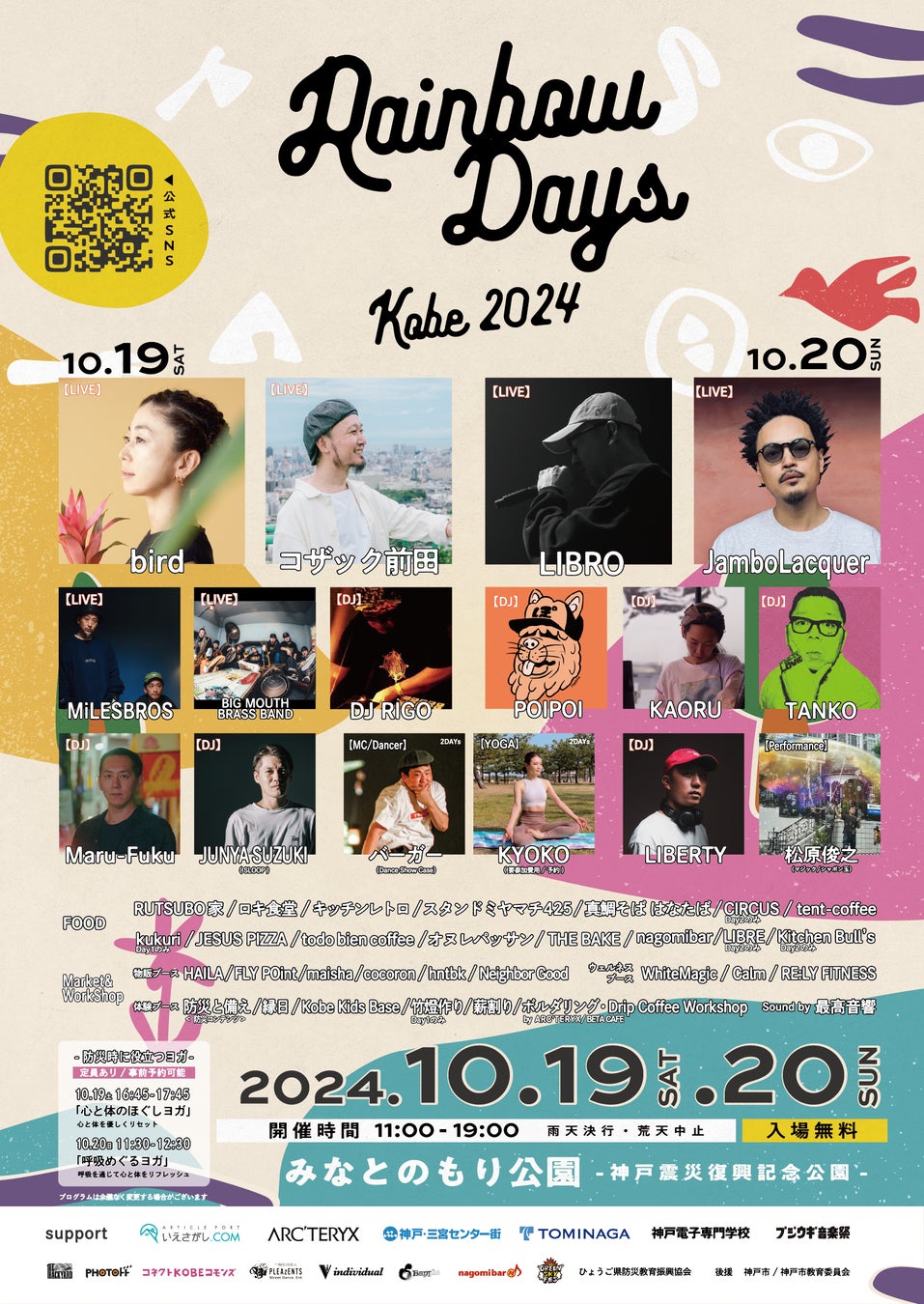 音楽・アート・ダンスなどのカルチャーを通じて、「まち」の魅力を発信する野外フェスティバル「Rainbow Days Kobe」。2020年より「神戸の魅力」「神戸だからこそ」をテーマに、毎年恒例で開催されています。阪神淡路大震災発生から30年を迎えるにあたり、今年はみなとのもり公園(神戸震災復興記念公園)を会場に「防災意識を高めるワークショップ」なども予定。そのほか、多彩な音楽やパフォーマンスをが楽しめるステージ、ボルダリングやヨガ体験、神戸で人気のお店が出展する物販・フードブースなど、多様なコンテンツをお楽しみいただけます。