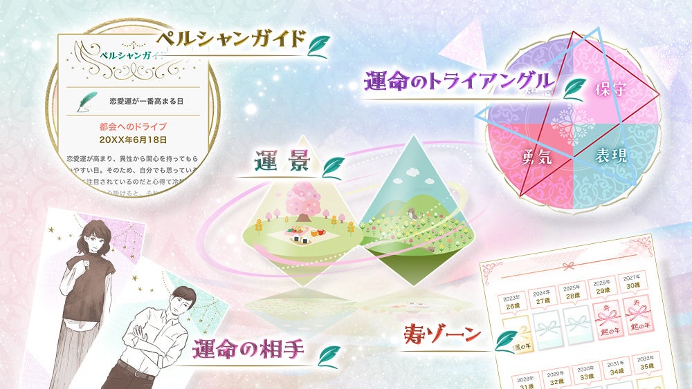 公式サイトの主要占術である「新ペルシャン占星術」とは違った観点での占い結果がわかる、もうひとつの占術「運景(ウンケイ)」。自然の景色のように、あなたに訪れる運気の流れや何十年先の転機のタイミングまでビジュアルでわかります。