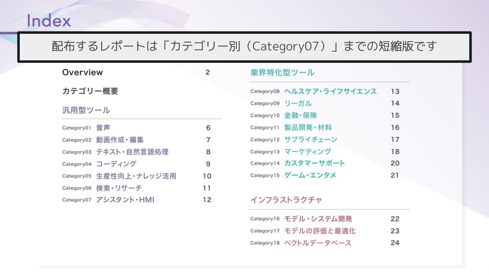 本レポートでは、今、注目の生成AI関連のスタートアップを「業界を横断して活用できる汎用性の高い生成AIツール」、「特定の業界向けの生成AIツール」、「生成AIツールのためのインフラストラクチャ」の3つに分け、カテゴリー別にご紹介します。