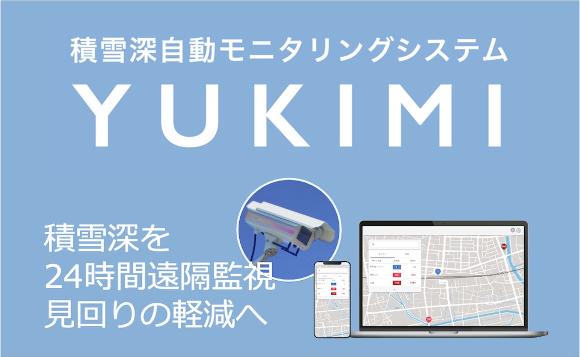積雪深自動モニタリングシステム『YUKIMI』(https://axelmark-iot.jp/yukimi/)は、「積雪深センサー」と「データ閲覧システム」が一体となった積雪状況モニタリングシステムです。本システムの導入により管轄路線内のセンサー設置地点の積雪状況を24時間リアルタイムに可視化し、自治体職員はじめ除雪に関わる方々がパソコンやスマートフォンから、いつでも積雪状況を確認できる状態を実現します。