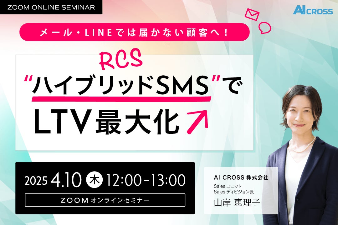AI CROSS株式会社(本社:東京都港区、代表取締役CEO:原田 典子、以下「AI CROSS」)は、当社主催の無料オンラインセミナー「メール・LINEでは届かない顧客へ!”ハイブリッドSMS”でLTV最大化」を2025年4月10日(木)12時より開催します。