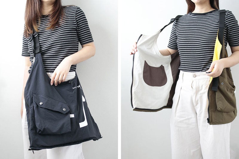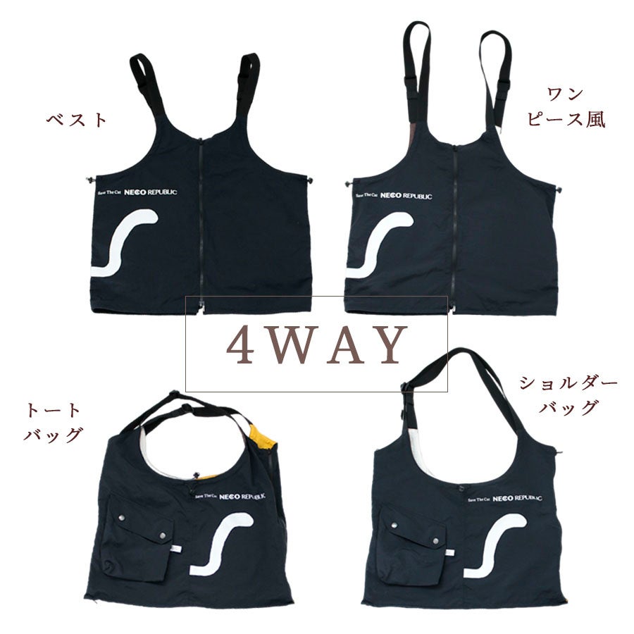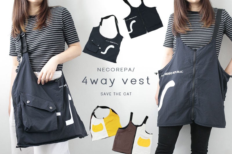 収益が保護猫活動に役立てられる「NECOREPA/」ブランドに新作が登場。ベスト・ワンピース風・トートバッグ・ショルダーバッグ。なんと4WAYの「NECOREPA 4wayベスト」