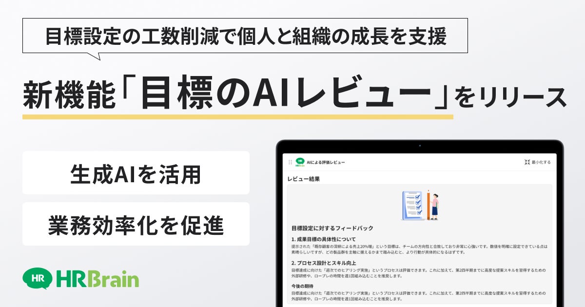 株式会社HRBrain(本社:東京都港区/代表取締役CEO:堀 浩輝、以下「当社」)は「HRBrain 人事評価」において生成AIを活用して目標設定の質を向上させる「目標のAIレビュー機能(以下、「本機能」)」を新たにリリースしました。