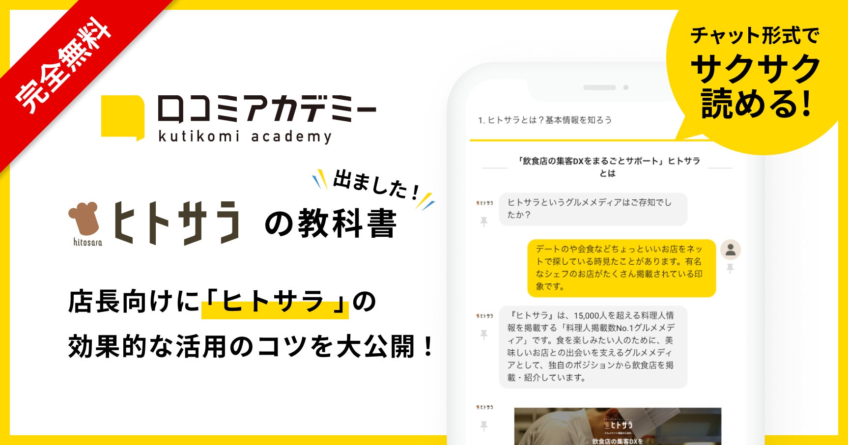 今回「口コミアカデミー」で公開した「ヒトサラの教科書」では、ヒトサラ公式監修の元コンテンツを製作。「ヒトサラ」の特徴や、効果的な使い方についてわかりやすく解説します。
