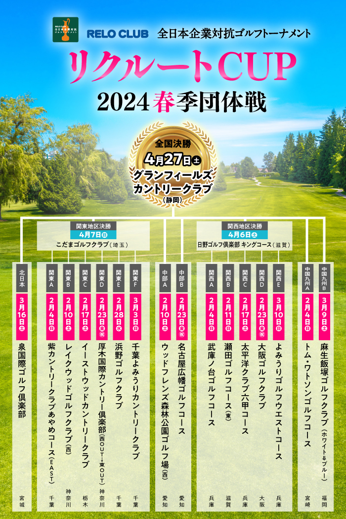 RELO CLUB全日本企業対抗ゴルフトーナメント「リクルートCUP 2024春季団体戦」の募集をしております。春季団体戦は2024年2月4日より開幕し、予選16会場 地区決勝2会場、全国決勝1会場<4月27日(土) 静岡県グランフィールズカントリークラブ>を予定。