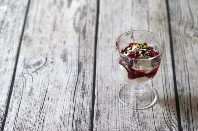 ホワイトチョコホイップにはホワイトチョココポー、ピスタチオ、フランボワーズソースをトッピングしました。