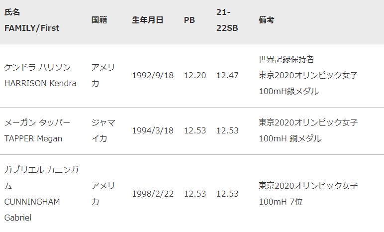 また、男子400mには東京五輪4×400mリレー金メダリストで日本人の母を持つマイケル ノーマン、女子100mハードル世界記録保持者で東京五輪銀メダルのケンドラ ハリソンが出場を予定しています。