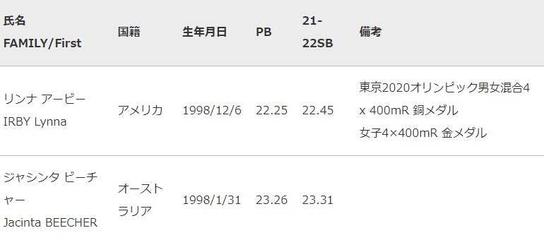 〇女子200mには、東京2020オリンピック男女混合4 x 400mリレーで銅メダル、女子4×400mリレー金メダルを獲得したリンナ アービー(アメリカ)がエントリー!