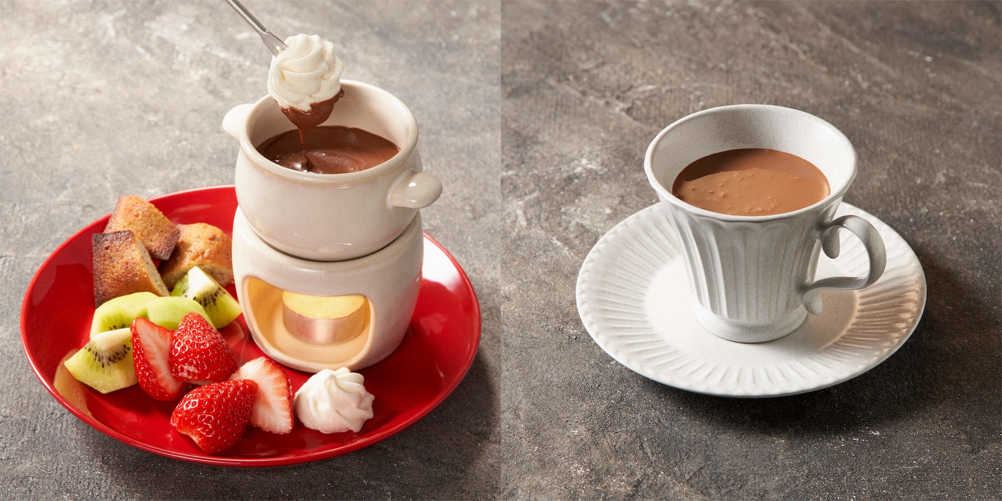 左から あったかフルーツショコラ(チョコレートフォンデュ)、ショコラショー