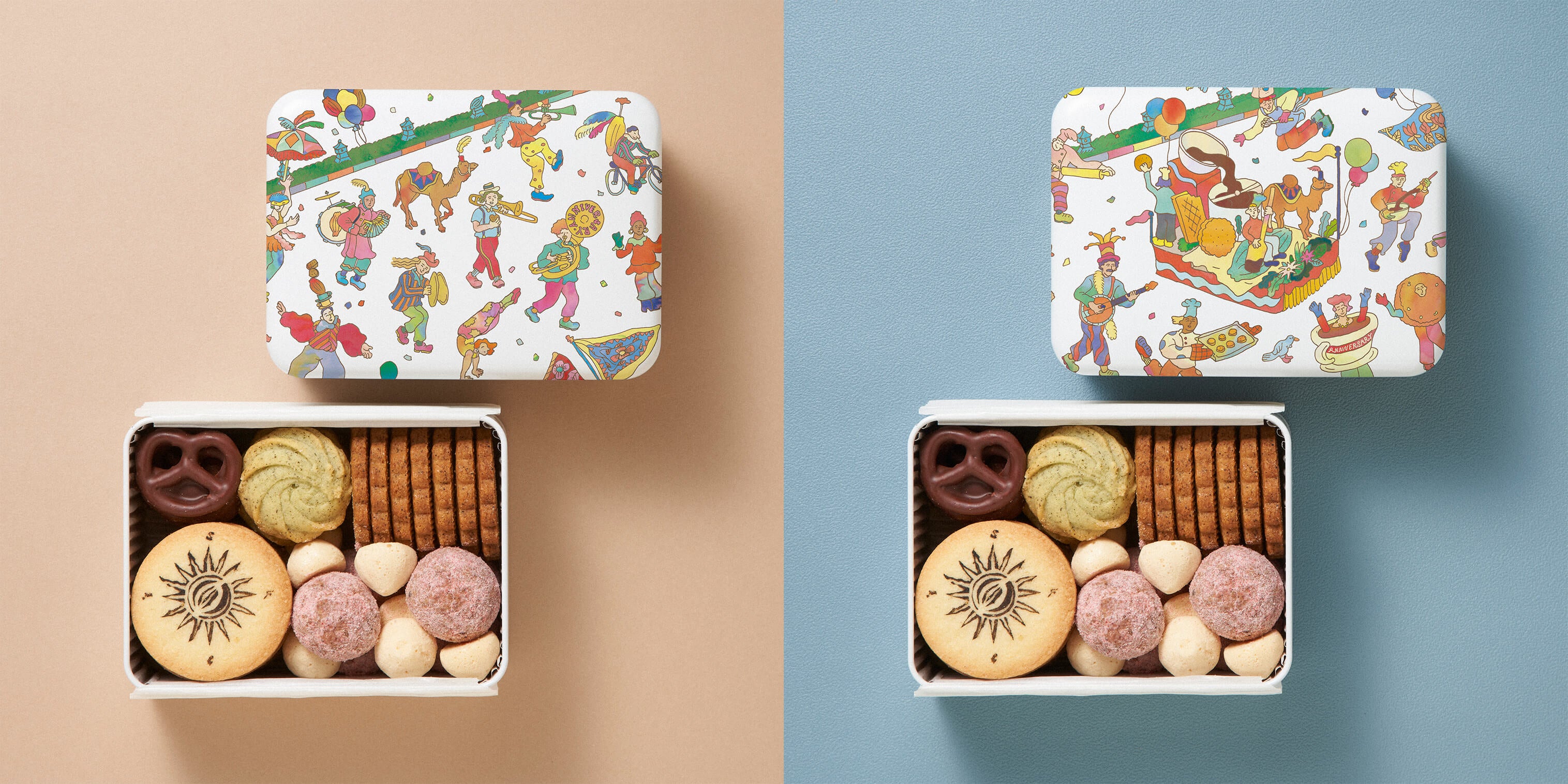 オープンを喜び、ショップ前の段葛と若宮大路をお祝いのパレードをする人々を描いた限定デザインのクッキー缶を数量限定にて発売します。