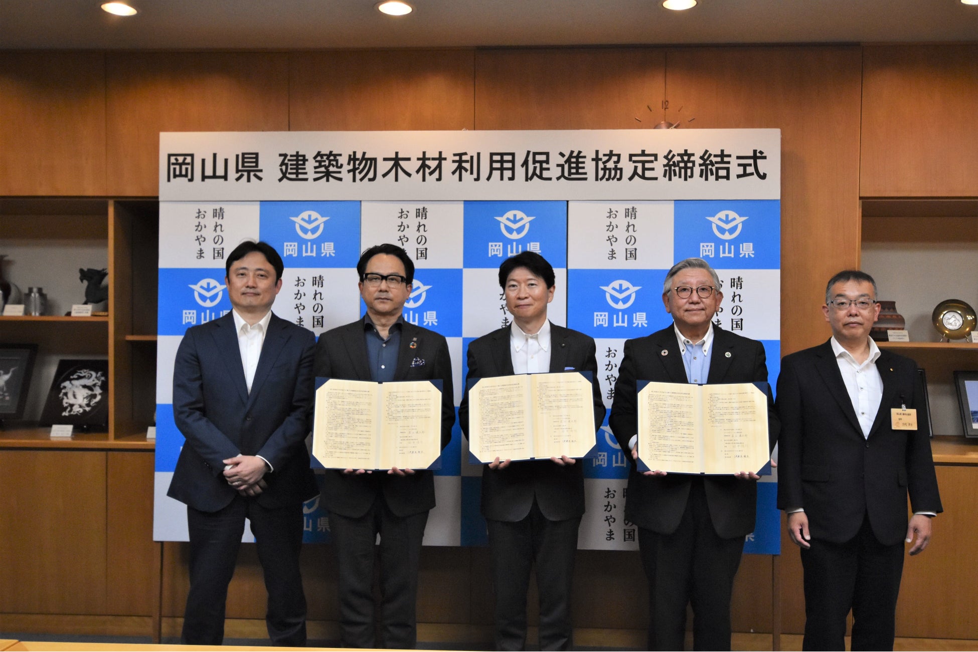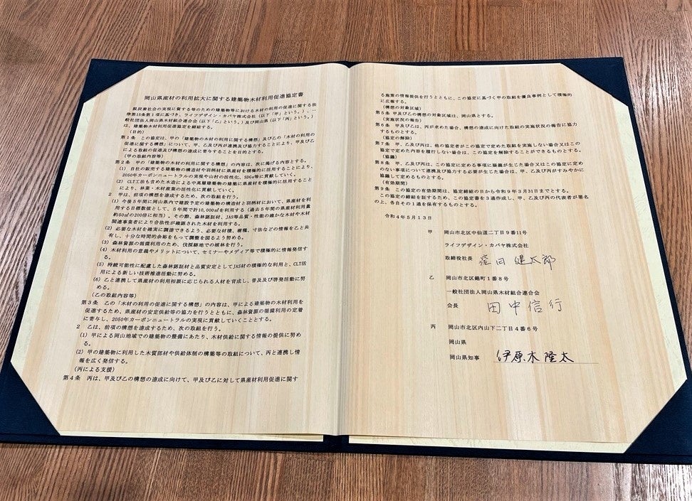 ライフデザイン・カバヤ株式会社(取締役社長:窪田健太郎/本社:岡山県岡山市)は、民間建築物における県産材の利用を促進するため、一般社団法人岡山県木材組合連合会(会長:田中信行/所在地:岡山県岡山市)及び岡山県(知事:伊原木隆太)と、『岡山県産材の利用拡大に関する建築物木材利用促進協定』を締結しました。
