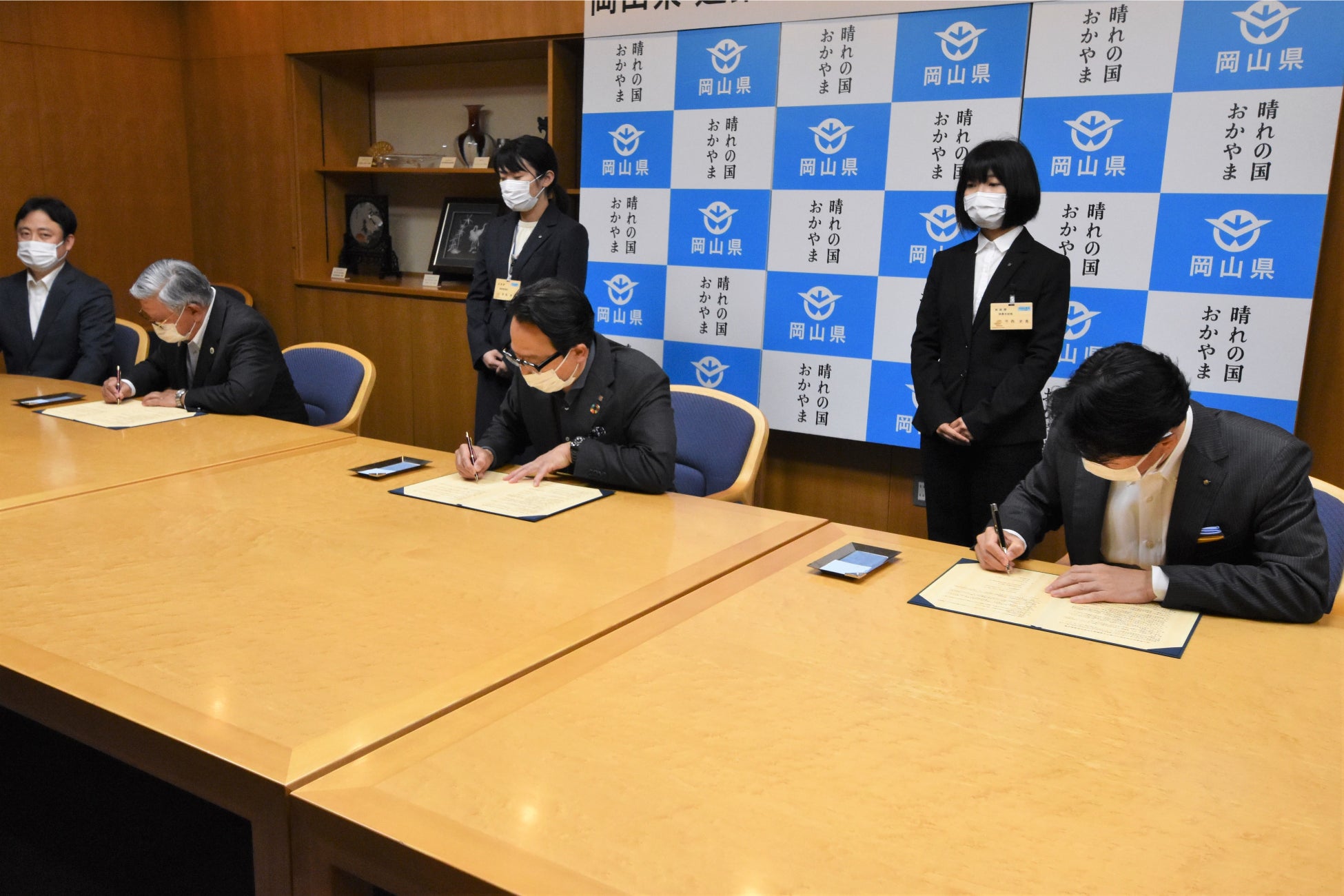 2022年5月13日(金)に岡山県庁にて締結式が執り行われ、田中信行氏(一般社団法人岡山県木材組合連合会 会長)、伊原木隆太知事(岡山県)、窪田健太郎(ライフデザイン・カバヤ株式会社 取締役社長) をはじめとする5名が出席しました。