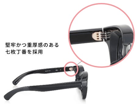 BE BOLDは、フレームの太さ(幅)が最大12mm、厚みが最大11mmとJINS史上最も太く、厚みのあるメガネ。ただかけるだけで存在感やアイコニックな個性を与えてくれます。一般的に重厚感のあるメガネは、フレームが太く厚くなるほど重くなってしまいデザインとかけ心地との両立が困難でした。BE BOLDは軽量樹脂素材「TR-90」を使用し、リムの内側の一部を削ぎ落としたように成形することで、極太なのに軽やかなかけ心地を実現しました。またテンプル(つる)に内蔵した板状のバネが頭をしっかりホールドしズレにくさにも配慮。丁番に堅牢かつ重厚感のある七枚丁番を採用するなど、充実した機能性とこだわりで極太フレームとは思えない快適なかけ心地を実現しました。専用ケースは、タイベック🄬素材にBE BOLDのロゴや製品スペックをプリントしたオリジナル仕様です。
