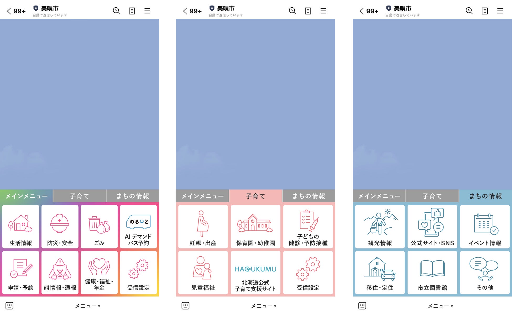 LINEのトーク画面下部に固定表示されているリッチメニューを切り替えることができる「タブ機能」を利用して、ジャンル別にメニューを表示させることができます。今回のリニューアルでは「メインメニュー」「子育て」「まちの情報」の3つのリッチメニューが新設されました。
