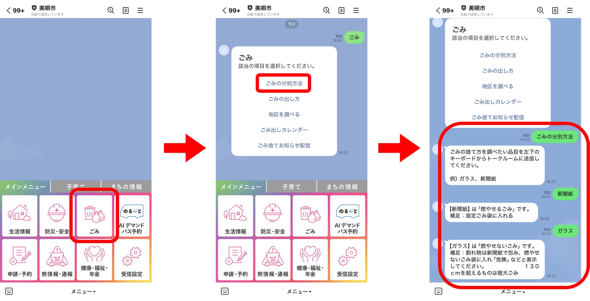 ごみのチャットボットでは、「ごみ分別検索」機能を導入。住民からの問い合わせが多いごみの分別方法をトーク画面の中でいつでも手軽に確認することが可能です。