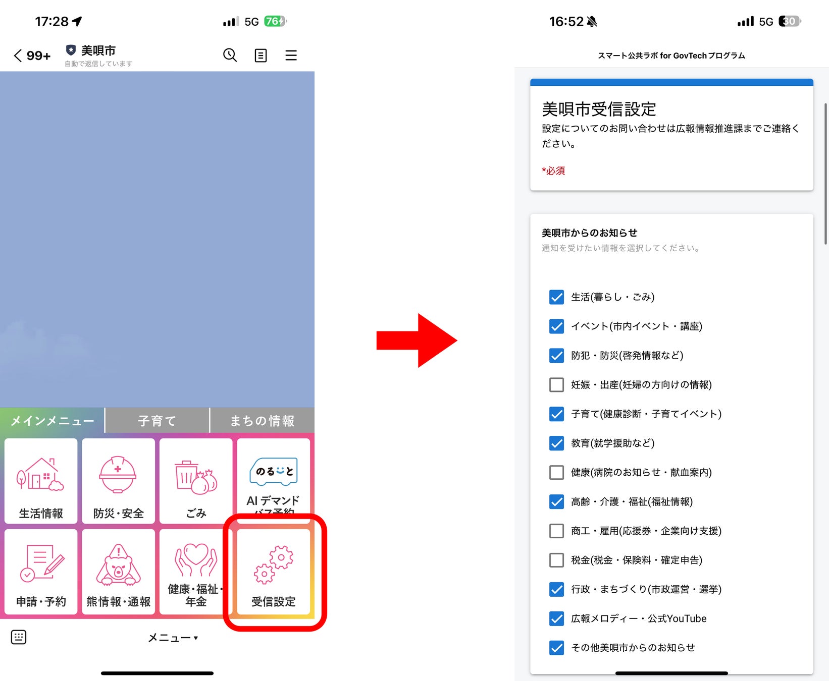 これまではLINEに登録している全ての住民に送られていた配信ですが、リニューアル後からは欲しい配信カテゴリーを「受信設定」に回答することでカスタマイズすることができます。住民がほしい情報に絞って配信ができるため、市からの情報発信がこれまで以上に効果的になることが期待されます。