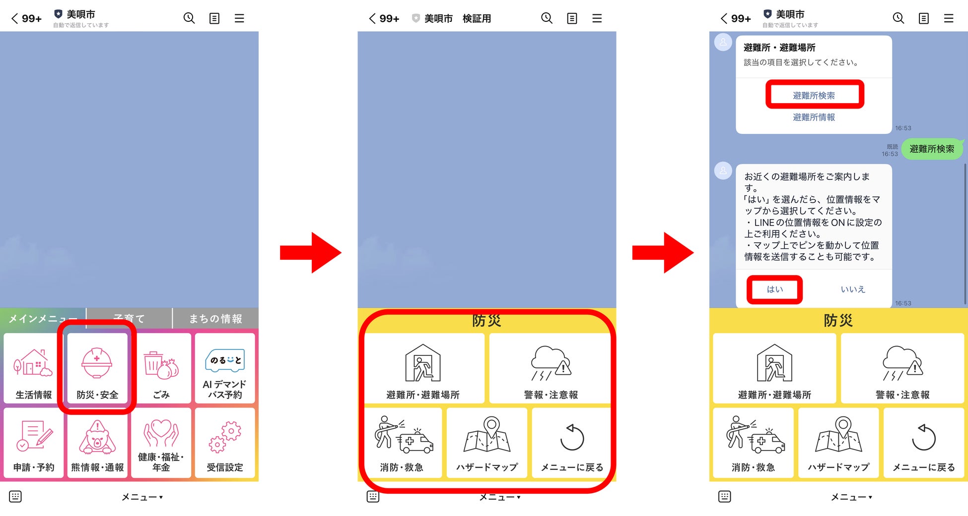 災害時の情報収集や避難所検索などの機能を提供します。災害の危険が迫っている場合などにリッチメニューが災害時モードに切り替わります。「避難所検索機能」は災害時モードでないときでも、メニューの「防災・安全」→「避難所・避難場所」→「避難所検索」から起動することができます。