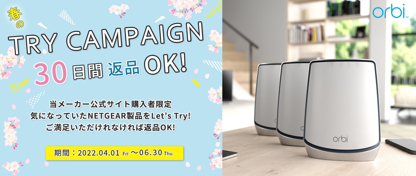 NETGEAR公式オンラインストアにてTRYキャンペーンを実施。対象製品をお使いいただき、ご満足いただけなかった場合、ご購入から30日以内であれば返品可能。