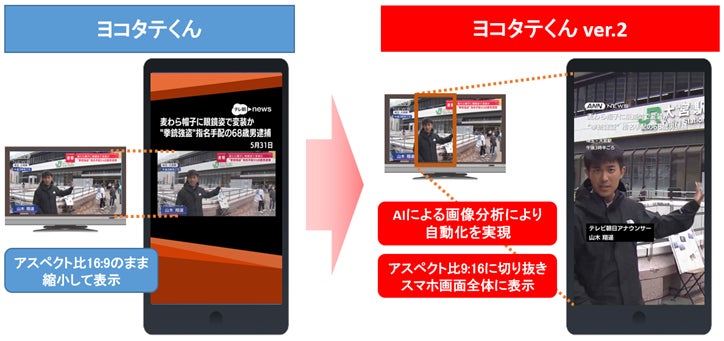株式会社テレビ朝日(本社:東京都港区、代表取締役社長 篠塚 浩)は、AIを利用してテレビサイズの横型動画(16:9)から、ネイティブ縦型動画(9:16=スマホ画面を余白なく使用した動画)を自動作成するシステム「ヨコタテくん ver.2」を開発し、2024年6月より運用を開始しました。これは、2023年に運用を開始した横型動画を縮小して縦型動画内に配置する「ヨコタテくん」の進化版になります。