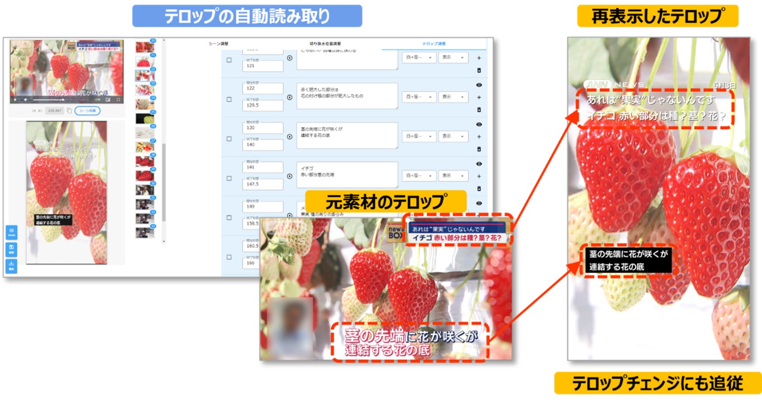 元の横型動画に表示されているテロップ情報をOCR処理によりテキスト情報化し、変換された縦型動画に改めてテロップとして表示する。