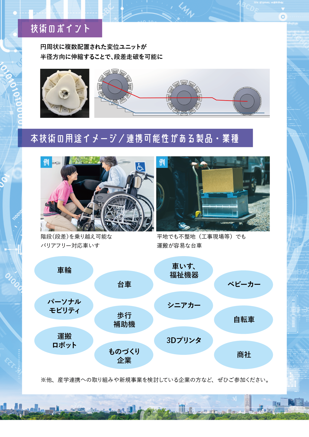 高い段差を乗り越えることが可能で、平地・不整地でも安定・快適に移動できる新しい構造の車輪技術のご紹介