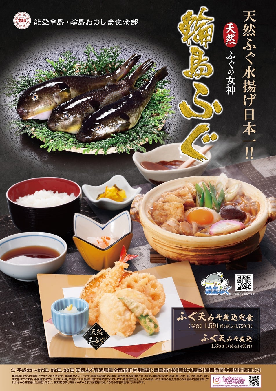 石川県輪島市は天然ふぐ水揚げ日本一(平成23~27年、29年、30年 天然ふぐ類漁獲量全国市町村別統計: 輪島市1位【農林水産省】海面漁業生産統計)を誇っており、その輪島市産天然ふぐの美味しさをより多くのお客様に知って戴けるよう、輪島市様のご協力を賜り、生産地応援メニューとして、開発いたしました。