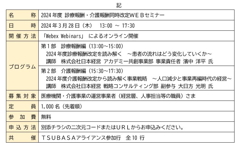 TSUBASAアライアンス参加行との「診療報酬・介護報酬同時改定WEBセミナー」の共催について