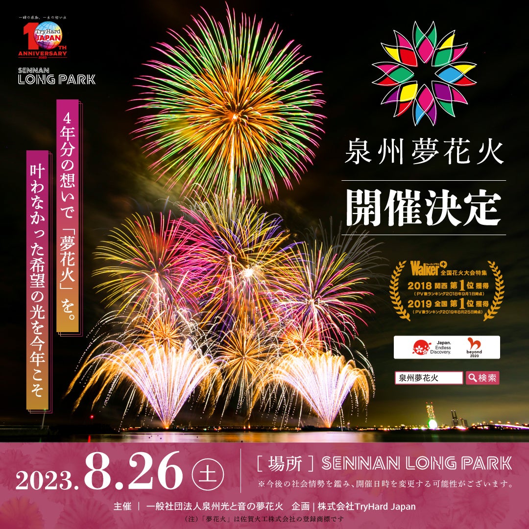 泉州の夏の風物詩として人気の「泉州夢花火」が3年越しの開催決定!関西国際空港を一望でき、「日本の夕陽百選」にも選ばれる泉南市の名所「サザンビーチ」の美しく開放的な大パノラマをバックに、息つく間も無く夜空を彩る無数の美しい花火が楽しめます。会場内では、さまざまなジャンルのフードトラックや大道芸人によるパフォーマンスショー、盆踊りや縁日など、花火が打ち上がるまでの時間をお楽しみいただける様々なコンテンツが盛りだくさん!さらに、今年はLEDを搭載した無数のドローンが織りなすドローンショーも行われます。音と光、特殊効果が織りなす素晴らしいひとときをお楽しみください。