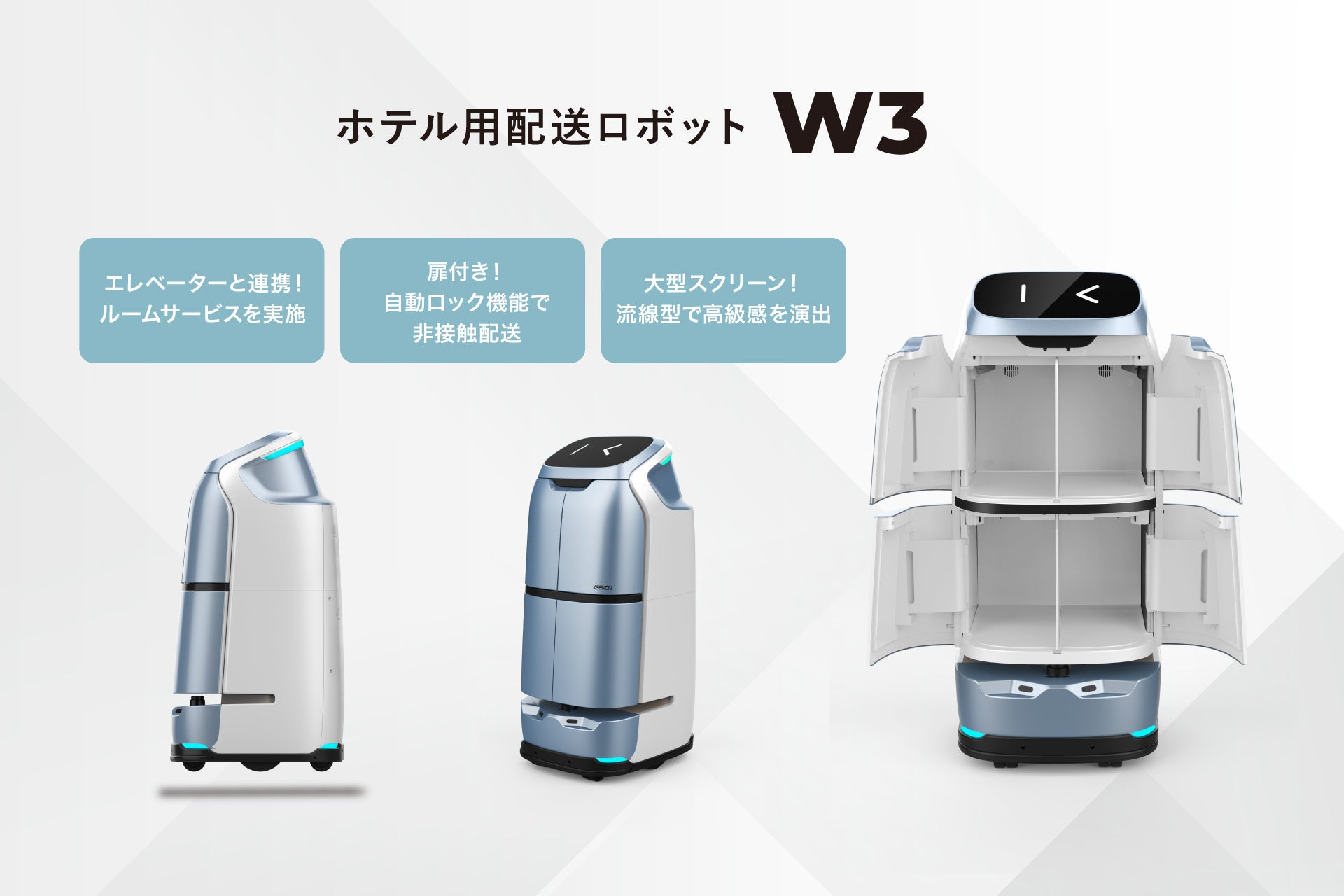 収納スペースと自動ロック機能付きです。エレベーターと連携したルームサービスも可能なため、高級レストラン・ホテルのルームサービスを非接触で実現します。
