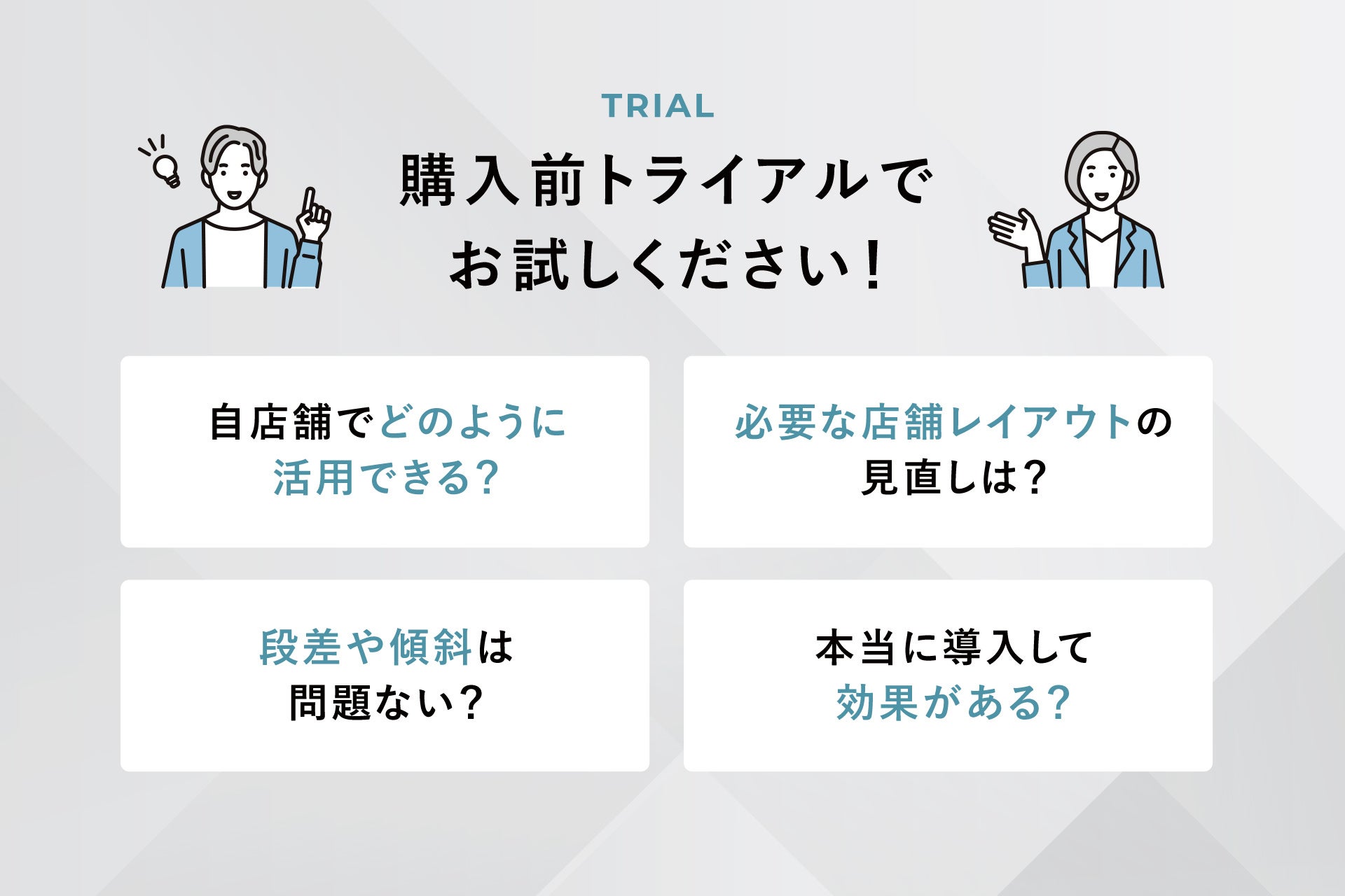 - 「”実演”展示」と「トライアルサービス」で導入イメージが明確に