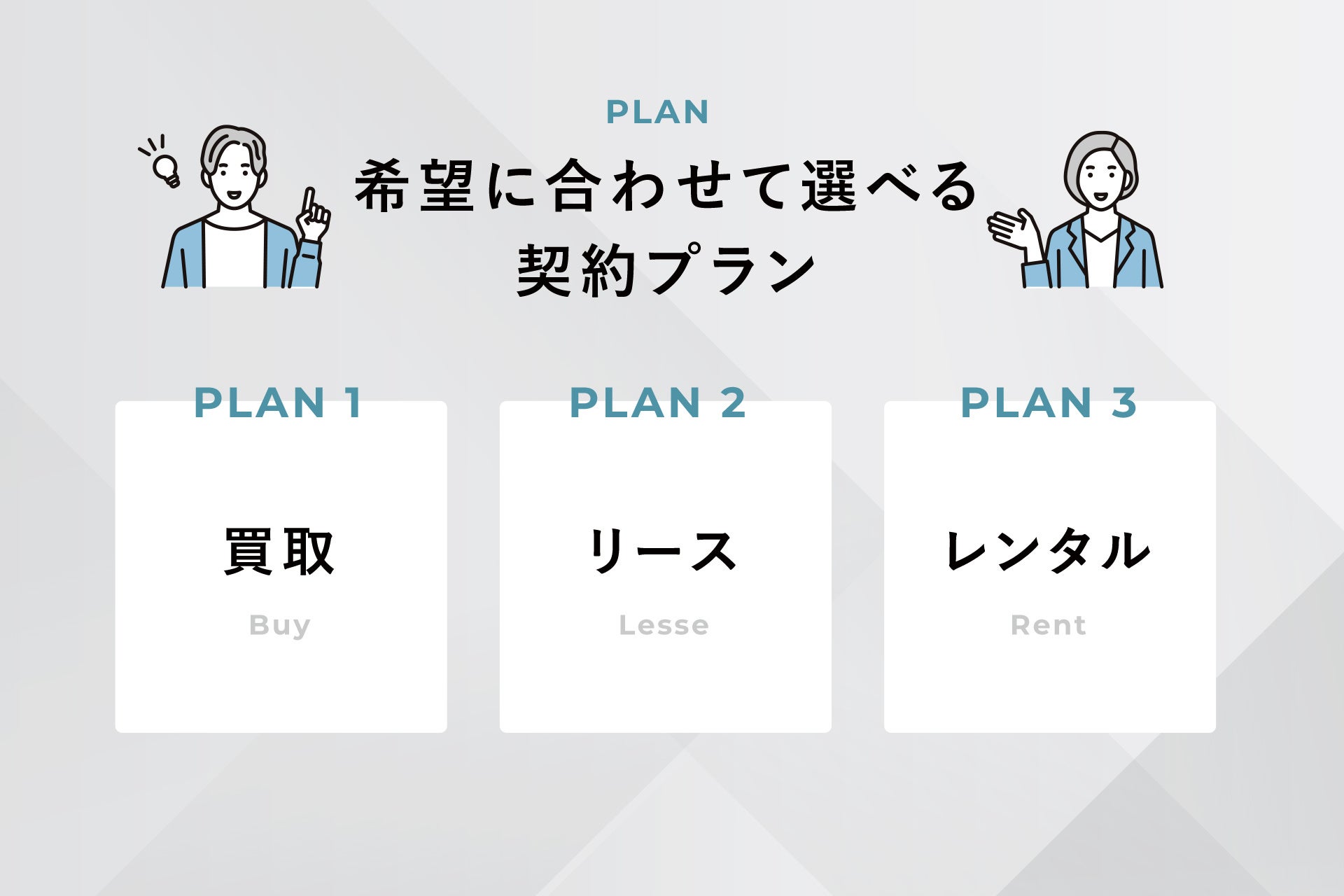 初期費用を抑えたい・自社用に新品を手に入れたい・長く使うことを想定して導入したいなどのお客様ごとの幅広い希望にお応えできるよう、買取・リース・レンタルの契約プランをご用意しております。ロボット導入についてお悩みの点がございましたら、お気軽にご相談ください。