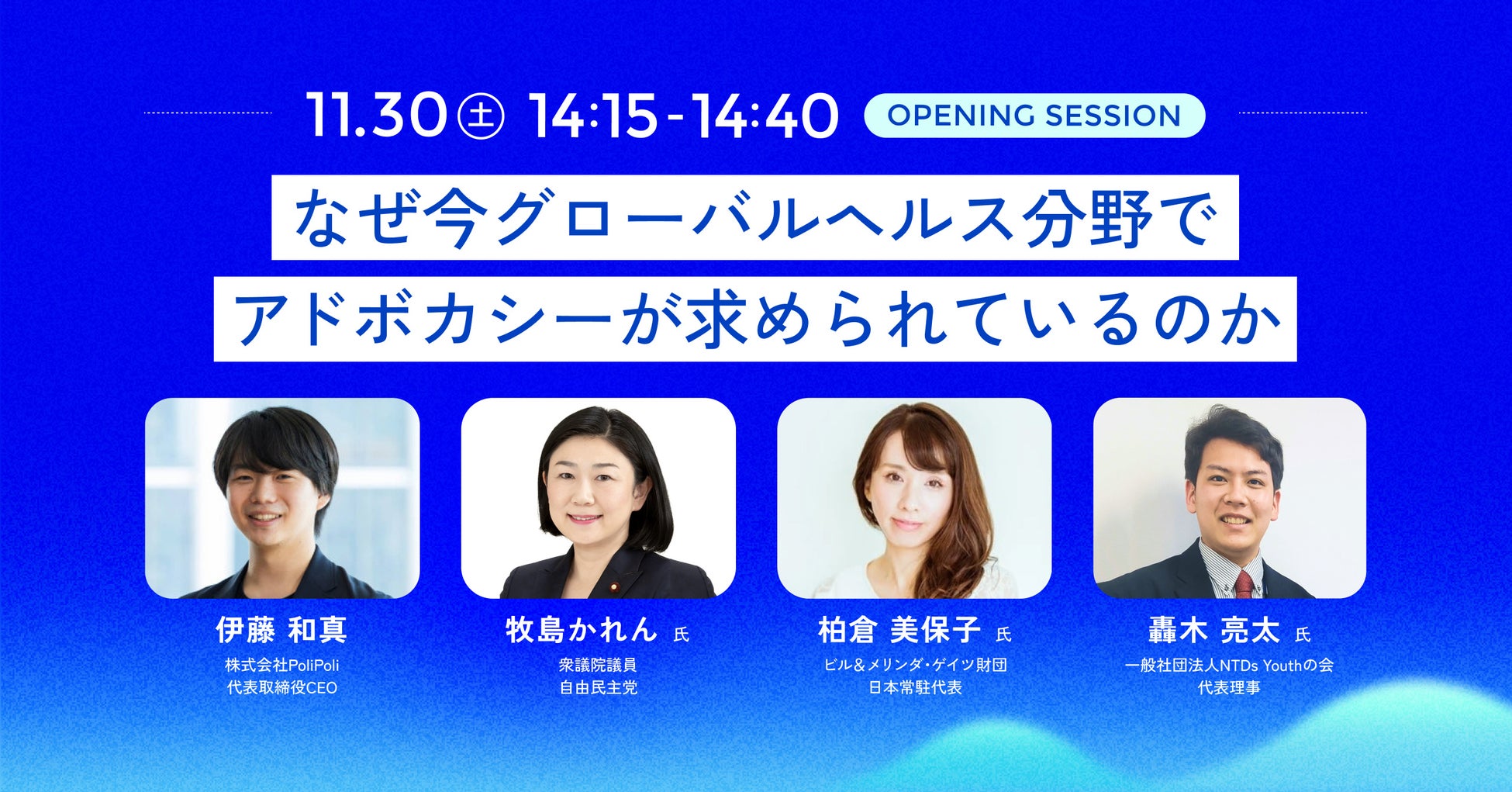 株式会社PoliPoli(東京都千代田区、代表取締役:伊藤和真、以下PoliPoli)は、「国際協力・グローバルヘルス分野でのアドボカシー活動※」をテーマにしたトークセッション形式のキャリアイベントを11月30日(土)に開催したことをお知らせします。