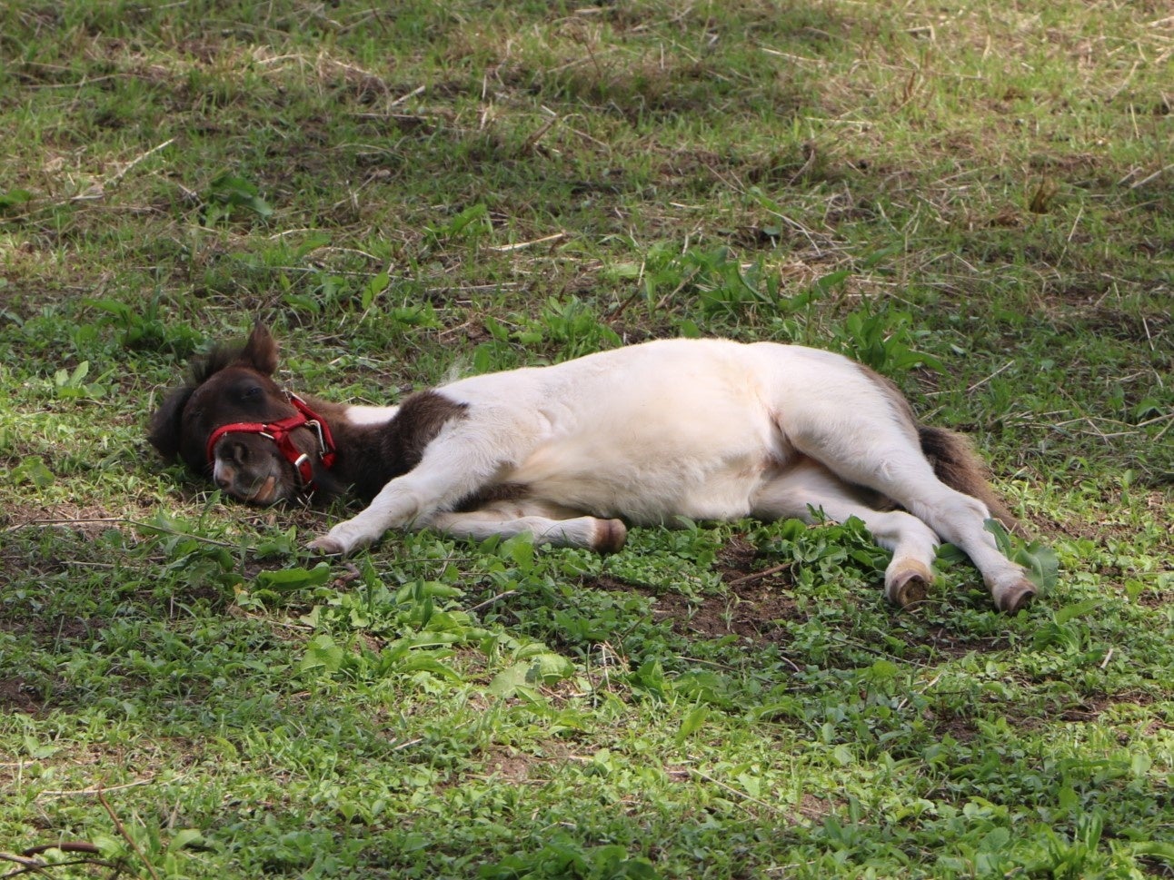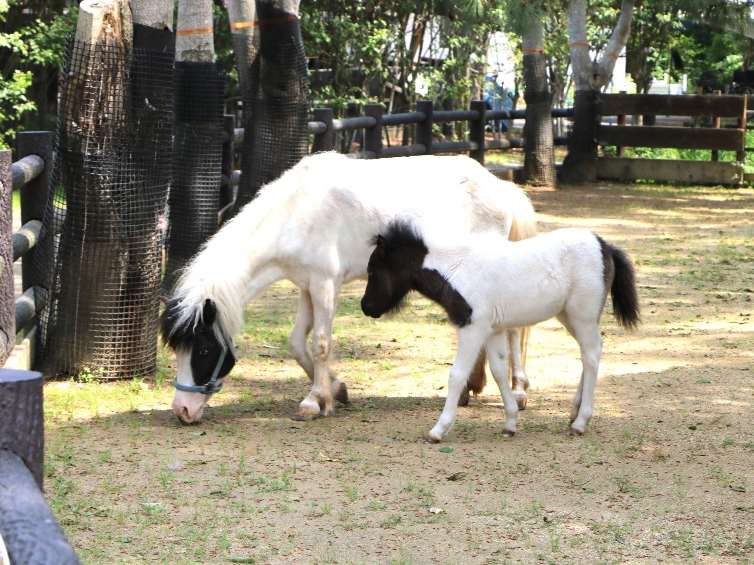 本公園で初めて、人工授精で誕生したポニーです。15日に生まれたことから、名前は語呂を合わせて「いごちゃん」。元気な女の子です。天気の良い日に展示しています。寝転んでお昼寝している姿(写真)や、お母さんのルチアに仲睦まじく寄り添う、ほっこりする様子が見られます。