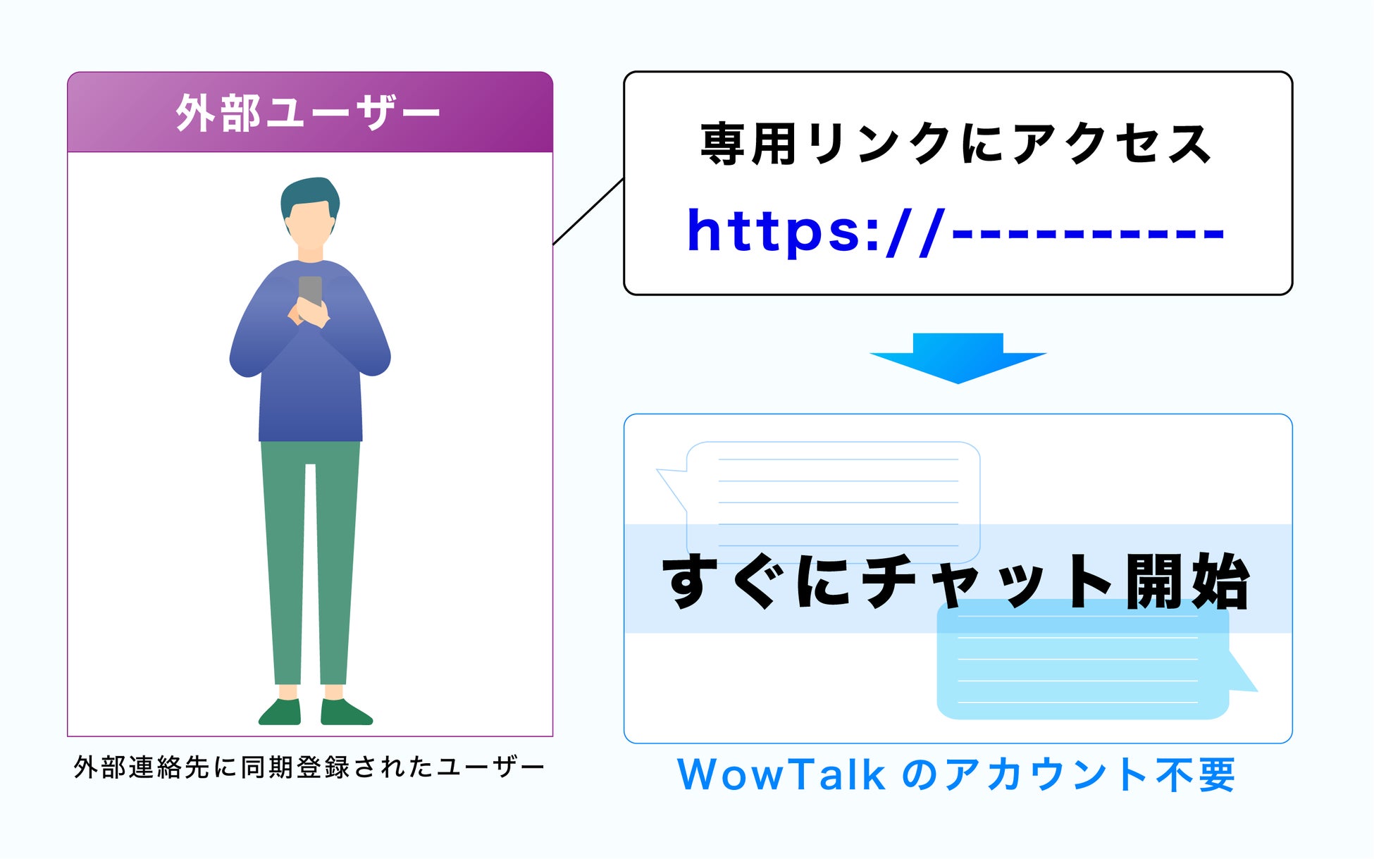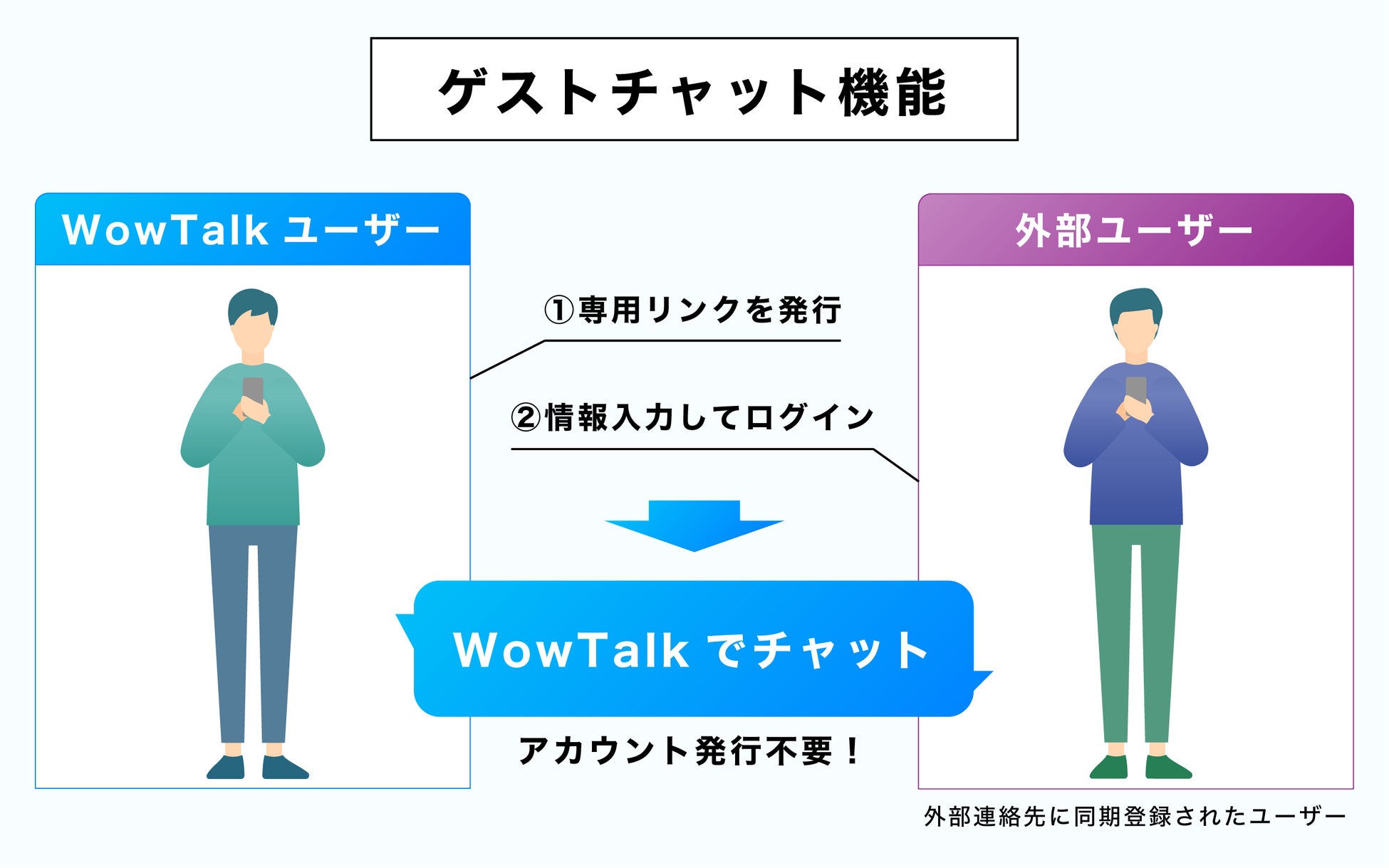 ゲストチャット機能をご活用いただくことで、外部ユーザーとWowTalkを使ったコミュニケーションが行えるようになります。WowTalkユーザーは日常から利用しているWowTalkにコミュニケーションの手段を一本化することができ、その都度ツールを切り替える手間が省かれます。