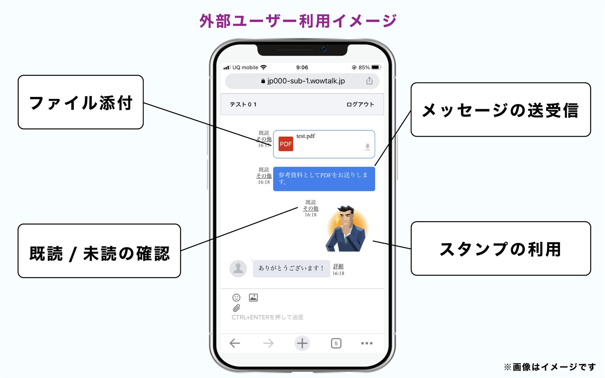 また、トークルーム内では「メッセージ」だけでなく、「ファイル添付」や「スタンプ」の機能も利用可能です。加えて、相手がそのメッセージを読んだかどうかがわかる「既読 / 未読」のステータスについても、外部ユーザー・WowTalkユーザーともに付与され、メッセージの閲覧状況が確認できます。