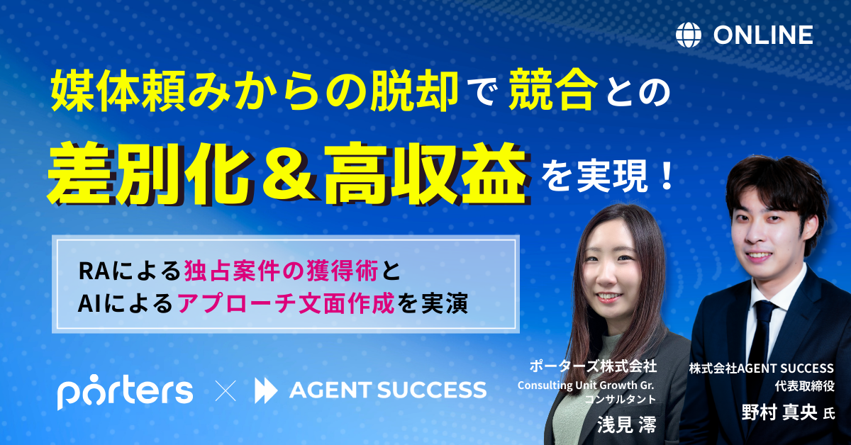 人材ビジネス向けマッチングシステムを提供するポーターズ株式会社(東京都港区、代表 西森 康二 )は、株式会社AGENT SUCCESSと共同で「媒体頼みからの脱却で競合との差別化&高収益を実現!RAによる独占案件の獲得術とAIによるアプローチ文面作成を実演」と題した無料セミナーを2026年4月14日(火)12:00~オンラインで開催いたします。
