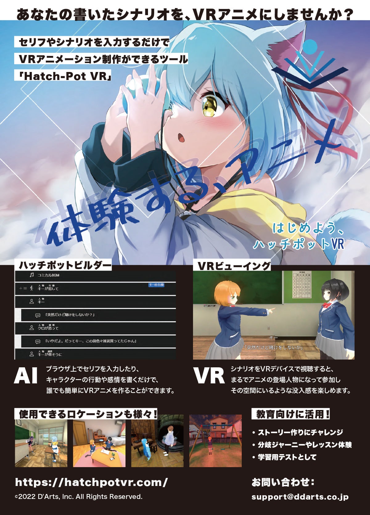 あなたの書いたシナリオを、VRアニメにしませんか?セリフやシナリオを入力するだけでVRアニメーション制作ができるツール「Hatch-Pot VR」です。ブラウザ上でセリフを入力したり、キャラクターの行動や感情を書くだけで、誰でも簡単にVRアニメを作ることができます。そして、作成したシナリオをVRデバイスで視聴すると、まるでアニメの登場人物になって参加しその空間にいるような没入感を楽しめます。