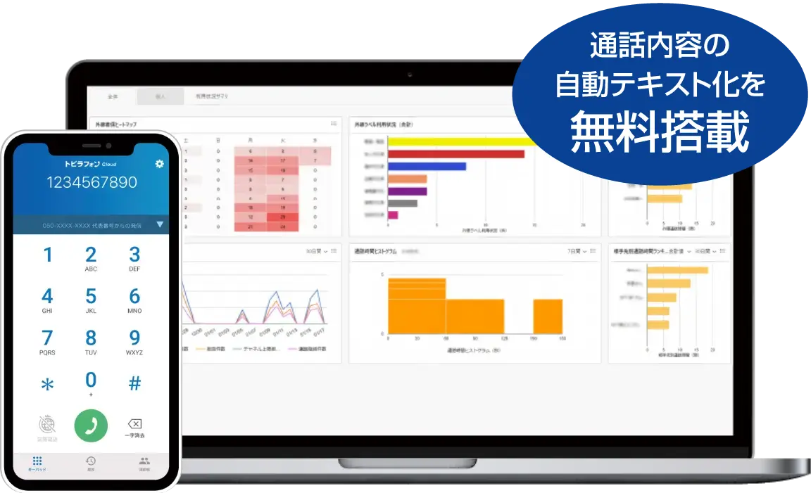 「トビラフォン Cloud」は、お持ちのスマートフォンに専用アプリをインストールすることで、市外局番や「050」で始まるIP電話番号を利用できるクラウド型ビジネスフォンです。外線・内線・転送・グループ着信・IVR(自動音声応答)・通話の文字起こしなど、ビジネスフォンに必要な機能を標準搭載しています。また、SalesforceやHubSpot、kintoneなどと外部連携が可能で、業務効率化を促進します。営業時間や休業日などの自動音声アナウンスもユーザー側で設定でき、仕事とプライベートの時間を管理できます。IVRや自動音声アナウンスを使用したコールフロー生成機能を使い、自社に合った柔軟な発着信設定が可能です。スマートフォンだけでなく、PCやIP電話機でも通話可能で、働き⽅に合わせた電話環境づくりを支援します。