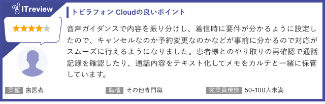 「トビラフォン Cloud」は「ITreview」で平均顧客満足度4.3を獲得しています(2025年10月22日時点 90レビュー)。当製品のご利用者様から実際に寄せられたレビューを一部ご紹介します。