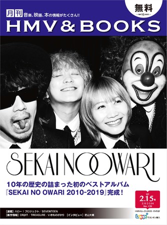 そして、『月刊HMV&BOOKS』の表紙には、デビュー記念日でもある2月10日にベストアルバム『SEKAI NO OWARI 2010-2019』をリリースした「SEKAI NO OWARI」が登場!
